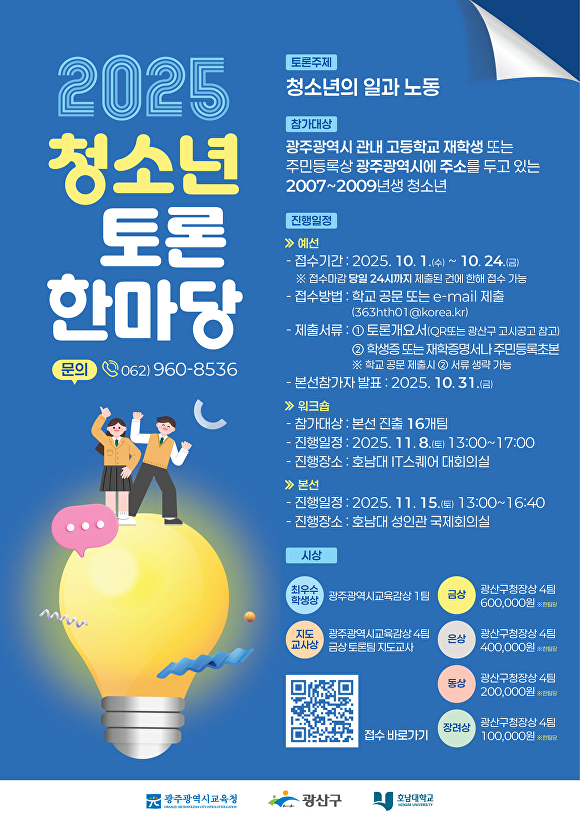 이번 청소년 토론한마당은 호남대학교·광주광역시교육청과 공동 주관하는 행사로, 청소년의 일과 노동을 주제로 진행된다.