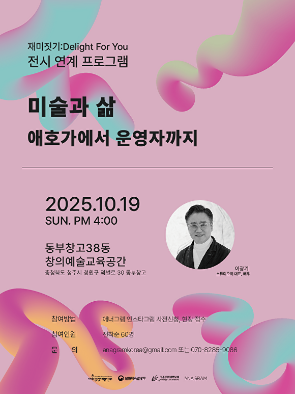 [아이뉴스24 장예린 기자] 청주공예비엔날레 조직위원회는 배우이자 아트 컬렉터인 이광기 스튜디오끼 대표와 함께하는 초청 강연 ‘미술과 삶’이 오는 19일 오후 4시, 충북 청주문화제조창 동부창고 38동에서 열린다고 16일 밝혔다.