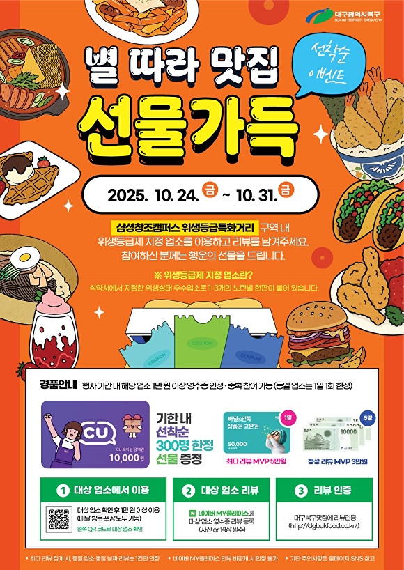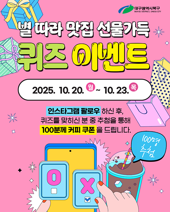 먼저 퀴즈 이벤트는 20일부터 23일까지 ‘대구북구맛집’ 홈페이지에서 참여할 수 있으며, ‘대구북구맛집’ 인스타그램 팔로우 후 퀴즈를 맞힌 정답자 중 100명을 추첨해 모바일 상품권(5000원 상당)을 지급한다.