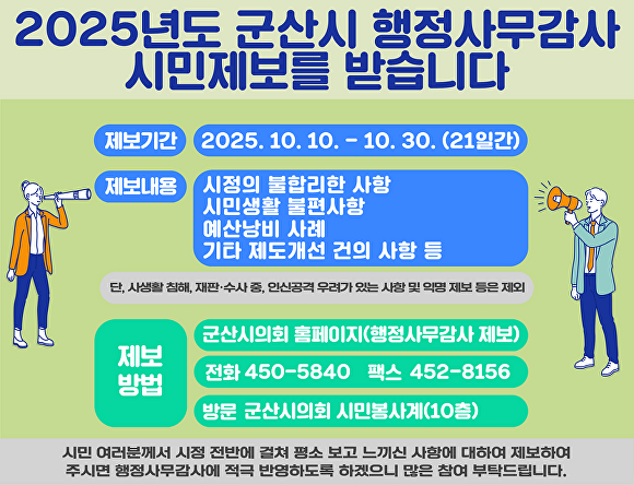 [아이뉴스24 김양근 기자] 전북 군산시의회(의장 김우민)는 오는 11월 17일부터 25일까지 9일간 실시되는 ‘2025년도 행정사무감사’를 앞두고 시민제보 접수 창구를 운영한다.