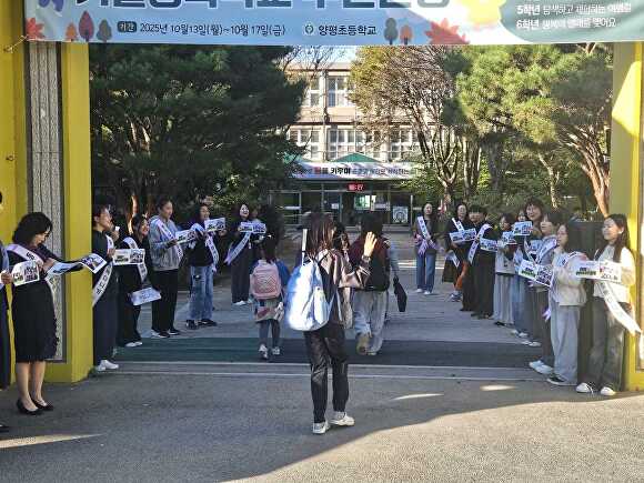24일 양평초 정문 앞에서 열린 ‘초등학생 등·하교 함께 다니기 캠페인’에는 학생과 학부모, 교직원, 교육지원청 관계자들이 함께 참여해 ‘사람이 사람을 지키는 등굣길’을 만들자는 메시지를 전했다.