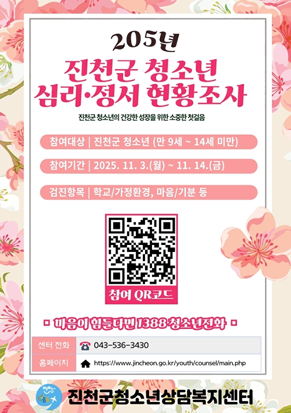 배이정 진천군 청소년상담복지센터장은 “지역사회 청소년들의 심리적 안정을 돕기 위해 이번 조사에 적극적인 참여를 바란다”고 전했다.