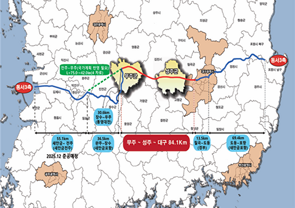 ‘무주~성주~대구 고속도로 건설사업’ 구간은 전북 무주군에서 경북 성주군을 거쳐 대구광역시로 이어지는 왕복 4차로로 총연장 84.1km이다.