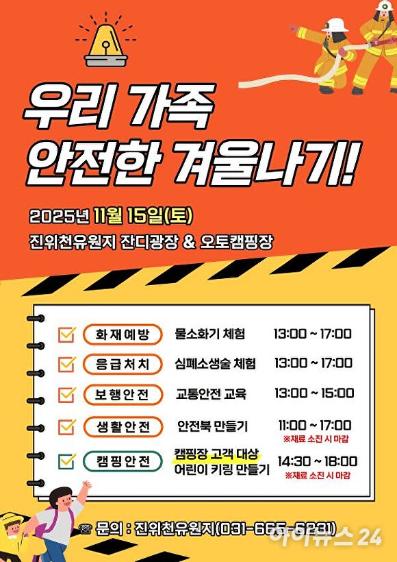 △화재 예방을 배우는 ‘물소화기 체험’ △위급 상황에 대비한 ‘심폐소생술 체험’ △겨울철 보행 안전을 위한 ‘교통안전 교육’ △생활 안전 수칙을 자연스럽게 익힐 수 있는 ‘안전북 만들기’ △오토캠핑장 이용 고객을 대상으로 한 ‘어린이 키링 만들기’ 등으로 꾸며진다.