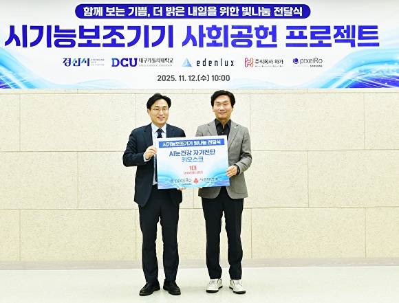 이날 행사에는 조현일 경산시장과 성한기 대구가톨릭대학교 총장, 참여기업인 ㈜에덴룩스·㈜하가·㈜픽셀로 대표, 지역 복지기관 관계자 등이 참석했다. 세 기업은 총 7대(약 1500만원 상당)의 시기능보조기기를 경산시 노인·어르신·장애인종합복지관 등 관내 복지시설에 기증했다.