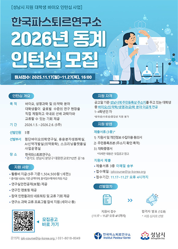 인턴십은 2026년 1월 5일부터 2월 6일까지 5주간, 성남시 분당구 소재 한국파스퇴르연구소(Institut Pasteur Korea)에서 진행된다. 참가 학생들은 질병 연구, 신약 개발, 감염병 대응 등 바이오헬스 핵심 연구 분야의 실제 연구 환경을 경험하게 되며, 연구진의 멘토링과 과학 세미나, 연구 교류 프로그램에도 참여할 기회가 주어진다.