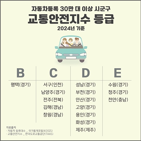 [아이뉴스24 임정규 기자] 경기도 평택시가 자동차등록 30만 대 이상 시·군·구 가운데 가장 높은 교통안전지수 등급을 기록한 것으로 나타났다.