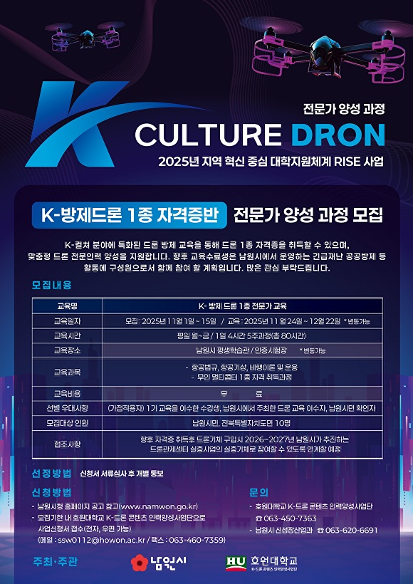 최경식 남원시장은 “이번 교육을 통해 단기-중기-장기 단계별 인력 양성 로드맵을 구축해 지역 드론 산업 생태계를 더욱 탄탄히 조성하겠다”고 밝혔다.
