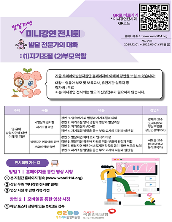 2편은 서보순 동의대학교 유아교육과 교수가 ‘발달지연 영유아를 위한 부모의 역할’을 다룬다.