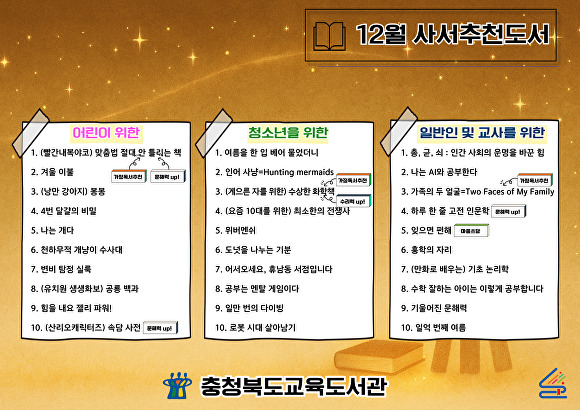 [아이뉴스24 장예린 기자] 충북교육도서관이 12월 사서추천도서 30권을 선정했다.