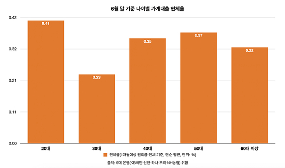 17일 5대 은행(KB국민·신한·하나·우리·NH농협) '나이별 가계대출 현황' 자료에 따르면 20대의 가계대출 연체율 0.41%로 1위를 차지했다. 50대(0.37%), 40대(0.35%), 60세 이상(0.32%), 30대(0.23%)가 뒤를 이었다.
