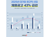 올해 대기업 정규직 신입 채용 공고 지난해보다 43% 감소올해 대기업 정규직 신입 채용 공고가 지난해보다 43% 감소했다는 조사 결과가 나왔다.24일 채용 플랫폼 캐치가 지난해와 올해(각 1~11월 기준) 자사 사이트에 게재된 대기업 정규직 신입 채용 공고를 분석한 결과, 올해 공고 수는⋯