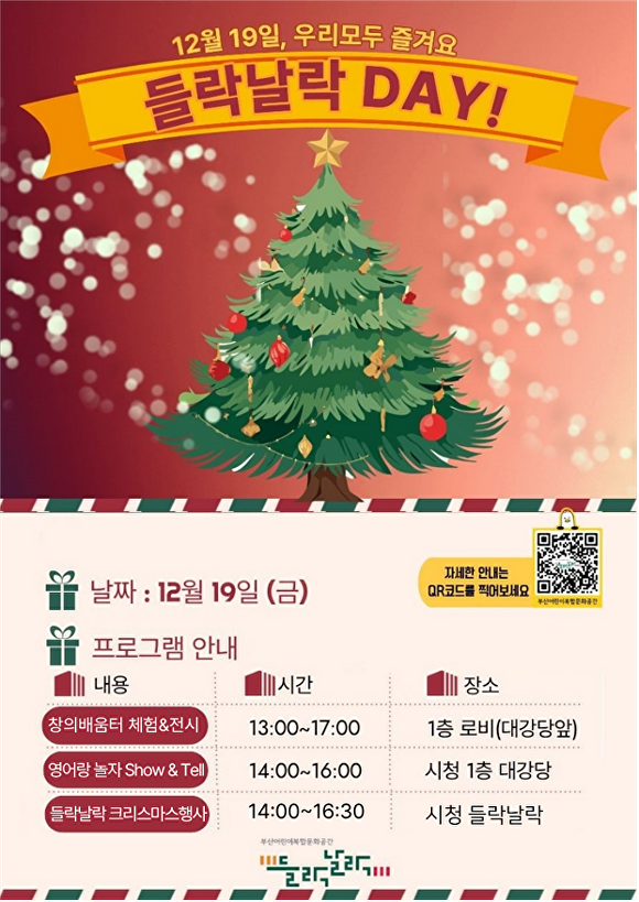 부산시, 19일 시청서 ‘들락날락 데이!’ 운영부산광역시가 19일 오후 부산광역시청 1층 대강당, 로비, 시청들락날락에서 ‘들락날락 데이!’를 운영한다. 이날 행사는 어린이복합문화공간 들락날락의 대표적인 특화프로그램인 ‘영어랑 놀자’와 ‘창의배움터’의 한 해 성과를 돌아보기 위해 마련됐다. 이⋯