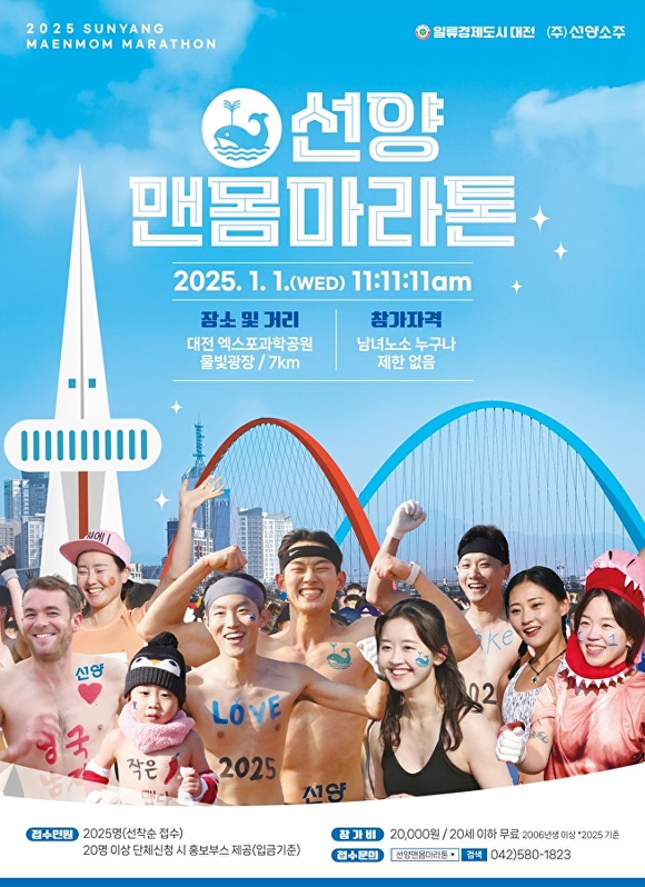 [아이뉴스24 박희석 기자] 선양소주는 을사년(乙巳年) 새해를 더 뜻 깊게 보낼 수 있는 새해맞이 이색 축제 ‘2025 선양 맨몸마라톤’을 1월 1일 대전엑스포과학공원 물빛광장(한빛탑)에서 개최한다고 11일 밝혔다.