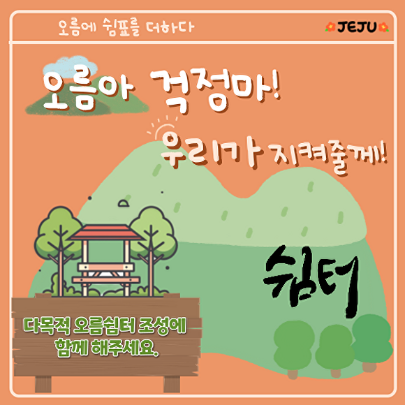 제주도는 ‘오름아 걱정마! 우리가 지켜줄게! 나도 제주오름 지킴이’ 사업을 통해 탐방객이 많은 오름에 경관 감상과 산불 대응이 가능한 다목적 오름쉼터를 조성할 계획이다.