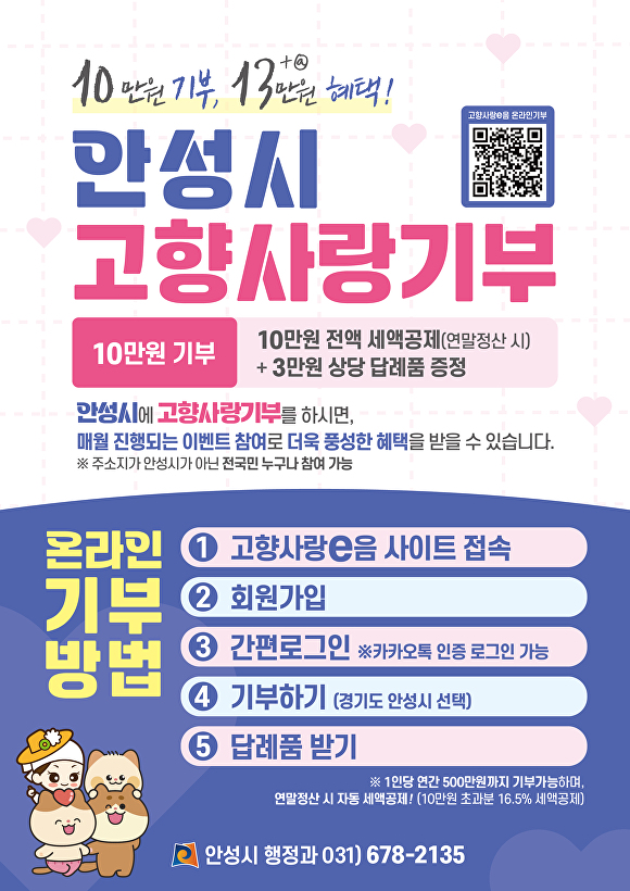 김보라 시장은 “지난해 모금 성과를 면밀히 분석해 고향사랑기부제 활성화를 위한 다양한 프로그램을 진행할 계획”이라며 “안성을 사랑하는 마음과 정성이 안성시 발전과 행복을 위해 효과적으로 쓰일 수 있도록 하겠다”고 말했다.
