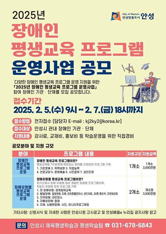 신청 자격은 안성시에 주소를 둔 장애인 평생교육 기관·단체다.