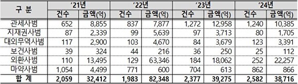 분야별로는 △밀수입, 관세포탈 등 관세사범은 1조 385억원, △위조상품, 저작권 침해 등 지재권사범은 1705억원, △전략물자 불법수출, 국산둔갑 허위표시 등 대외무역사범은 3391억원, △불법 식·의약품 등 보건사범은 112억원, △자금세탁, 가상자산 이용 환치기 등 외환사범은 2조 2257억원, △필로폰, 케타민 등 마약사범은 866억원 상당이다.