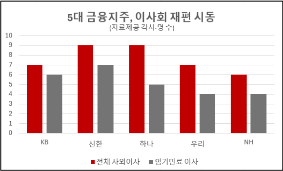 하나금융은 9명 중 5명이 임기 만료다. 이정원 이사회 의장도 임기 6년을 채워 이사회 구성에 변화를 줄 것으로 예상한다. 또 이사회에 내부통제 위원회를 설치해 내부통제 역량을 강화하기로 했다.