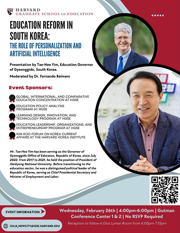 임 교육감은 간담회 이후 대한민국 교육감 최초 하버드대학교 학생을 대상으로 특강을 진행한다. 주제는 ‘한국의(경기도) 교육개혁: 학생 맞춤형 교육과 인공지능의 역할’이다.