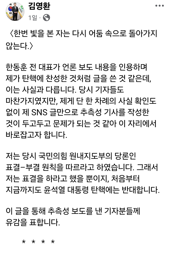 앞서 김영환 지사가 지난해 12월 12일 페이스북에 “헌법기관인 국회의원들은 책임감을 갖고 탄핵 표결에 임해야 한다”고 적자, 일부 언론은 이를 ‘탄핵 찬성’으로 해석해 보도했다.