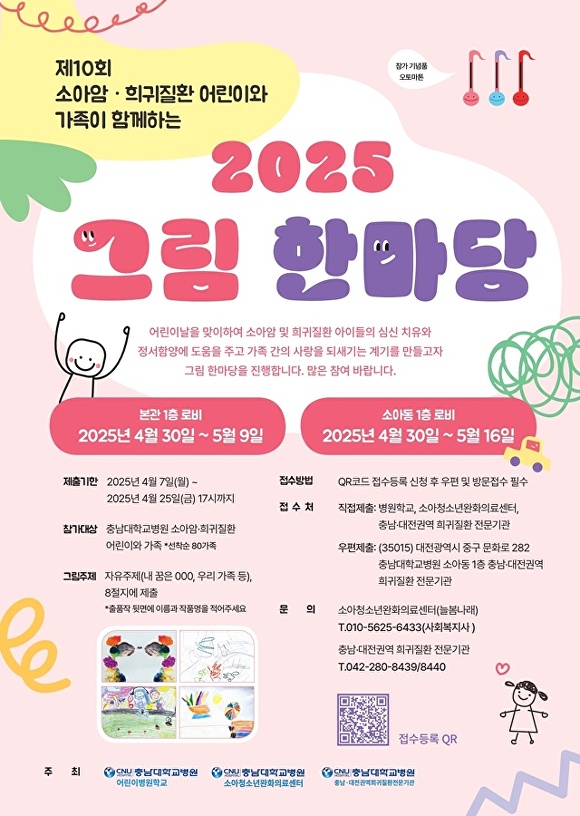 [아이뉴스24 박희석 기자] 충남대학교병원 어린이 병원학교와 소아청소년완화의료센터, 충남·대전권역 희귀질환 전문기관은 어린이날을 맞아 제10회 소아암·희귀질환 어린이와 가족이 함께하는 2025 그림한마당을 연다고 밝혔다..