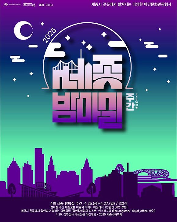 [아이뉴스24 강일 기자] 세종시가 다채로운 야간 문화행사를 통해 시민과 관광객들에게 특별한 경험을 선사하는 ‘세종 밤마실 주간’을 운영한다.