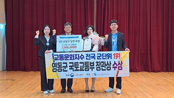 [아이뉴스24 윤재원 기자] 충북 영동군이 교통문화지수 평가에서 군 단위 전국 1위를 차지해 국토교통부 장관상을 차지했다. 시상식은 23일 경북 상주에 있는 한국교통안전공단에서 있었다.