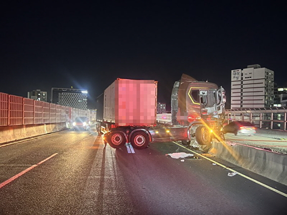 [아이뉴스24 박채오 기자] 29일 오후 10시 18분쯤 부산 사상구 관문대로(모라~당감동 방면)를 운행하던 트레일러 차량이 우측 벽면을 들이받는 사고가 발생했다.