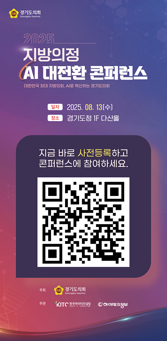 한편, 이번 콘퍼런스는 경기도의회 공식 유튜브를 통해 전 과정이 실시간으로 생중계되며, 행사에 참여하려면 사전등록 사이트(https://inviteme.kr/2025GGD-AI/) 또는 QR 코드를 통해 신청하면 된다.