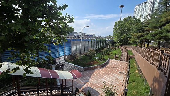 이중 지붕 달린 나무 계단과 태양광 조명시설은 인근 두산에너빌리티와 HD한국조선해양이 각각 5000만원씩 기부한 기금(1억원)으로 설치했다. 해당 시설은 성남시에 기부채납 예정이다.