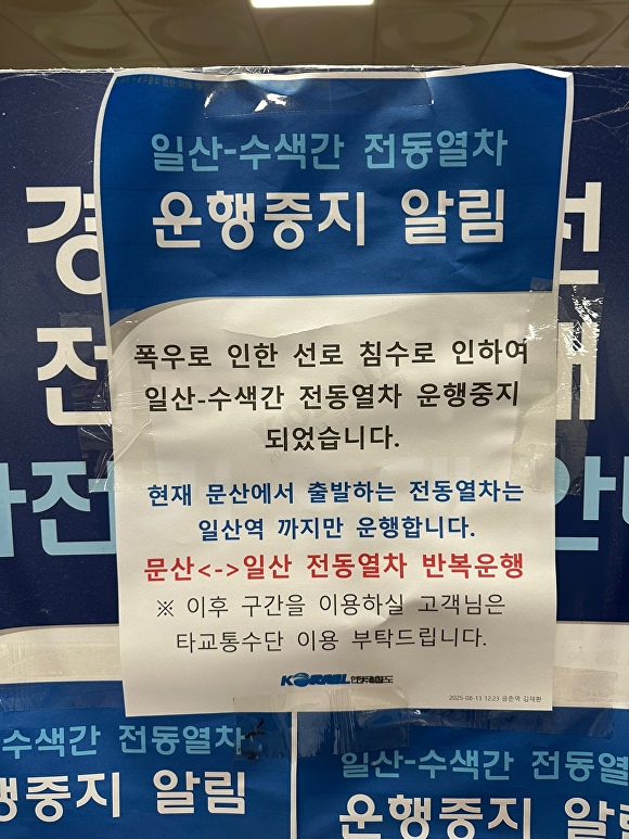 코레일은 이날 12시 30분 안내문을 통해 폭우로 인한 선로 침수로 일산-수색간 전동열차가 운행 중지됐다고 밝혔다.