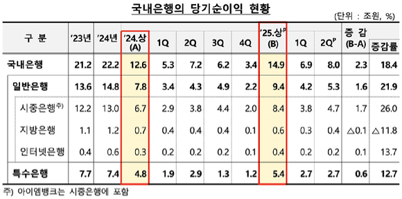시중은행과 인터넷은행의 순이익은 각각 8조4000억원, 4000억원으로 전년보다 26%, 13.7% 늘었다. 특수은행도 5조4000억원으로 12.7% 상승했다. 지방은행은 6000억원으로 11.8% 감소했다.