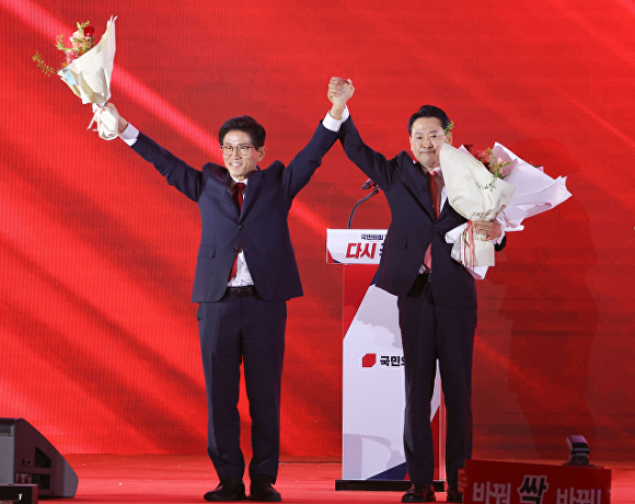 22일 충북 청주시 흥덕구 청주오스코에서 열린 국민의힘 제6차 전당대회에서 결선에 진출한 김문수, 장동혁 당대표 후보가 꽃다발을 받은 뒤 맞잡은 손을 들어 올리고 있다 [사진=연합뉴스]