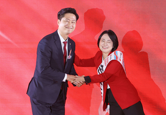 22일 충북 청주시 흥덕구 청주오스코에서 열린 국민의힘 제6차 전당대회에서 청년 최고위원에 당선된 우재준 후보(왼쪽)가 손수조 후보의 축하를 받고 있다. [사진=연합뉴스]