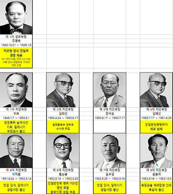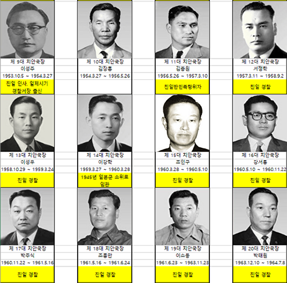 김태선 이익흥 홍순봉 문봉제 김종원 등 역대 치안국장 다수는 친일반민족행위자 명단, 조선총독부 관보, 당시 언론 보도를 통해 일제 경찰 경력이 확인됐다.