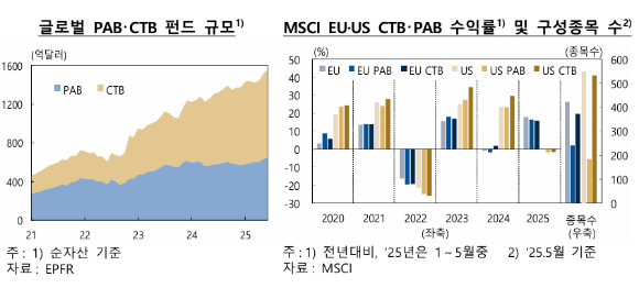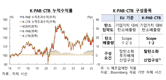 한은은 "K-PAB·CTB는 모지수(KOSPI)와 유사한 재무성과를 유지하면서도 포트폴리오의 기후리스크를 줄이는 구성이 가능하다"며 "탄소 감축 효과를 반영한 정량적 투자 기준을 제시하고 국내 기후 금융의 질적 개선, 글로벌 경쟁력 강화에 기여할 것"이라고 말했다.