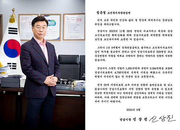 신 시장은 서한문에서 “양질의 의료서비스 제공과 공공보건의료사업 확대·강화를 위해 성남시의료원 대학병원 위탁운영 승인을 요청했으나 보건복지부로부터 승인 여부가 통보되지 않아 509병상 규모 공공병원의 역할을 제대로 수행하지 못하는 안타까운 상황에 직면해 있다”고 지적했다.