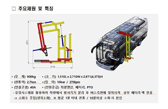 전기버스 화재진압장치는 유압 시스템을 활용해 버스 측면에서 상부 배터리팩을 직접 관통한 뒤 소화수를 주입하는 방식으로, 전기버스 화재의 핵심 위험 요소인 배터리 열폭주를 억제하고 재발 위험을 낮추는 데 중점을 둔 장비다.