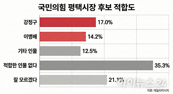 국힘 평택시장 후보 적합도 조사에서는 강정구 평택시의장이 17.0%, 이병배 전 평택시의회 국민의힘 대표의원이 14.2%를 기록해 오차범위 내에서 각축을 벌이는 것으로 조사됐다.