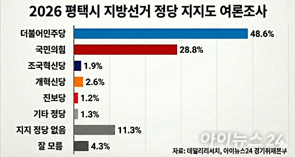 이번 조사는 '아이뉴스24경기취재본부' 의뢰로 ㈜데일리리서치에서 2월 7일부터 8일까지 이틀간 경기도 평택시에 거주하는 만18세이상 남녀 500명을 대상으로 실시했다. 조사 방법은 유무선ARS전화조사, 피조사자 선정방법은 통신사제공 휴대전화가상번호 78%, 유선전화RDD 22%이며, 최종 응답률은 2.4%, 표본오차는 95% 신뢰수준에서 ±4.4%p 이다. 2026년 1월 행정안전부 주민등록 인구통계 기준 성별, 연령별, 지역별 가중값 부여(셀가중)했으며, 자세한 조사개요와 결과는 중앙선거여론조사심의위원회 홈페이지를 참고하면 된다.