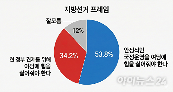 6월 지방선거 프레임에 대한 질문에서는 '안정적인 국정운영을 여당에 힘을 실어줘야 한다(국정 안정)' 53.8%, '현 정부 견제를 위해 야당에 힘을 실어줘야 한다(정부 견제)' 34.2%로, 국정 안정론이 19.6%p 앞섰다.