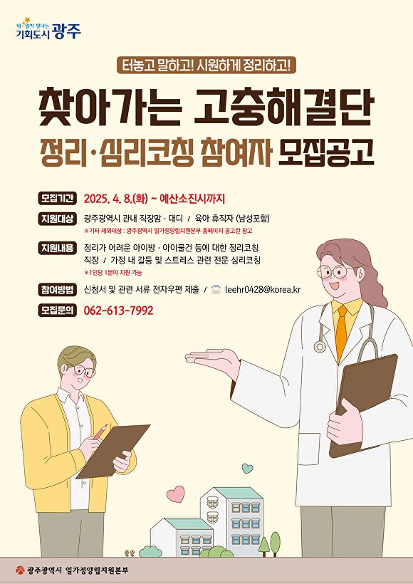 신청은 이메일로 접수받으며, 예산 소진 때까지 가능하다. 자세한 내용은 광주시 일가정양립지원본부 누리집 공지사항에서 확인할 수 있다.