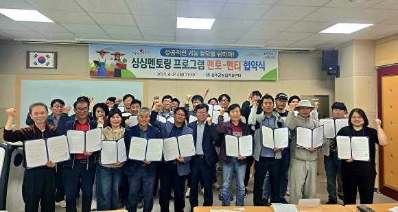 [아이뉴스24 이창재 기자] 경북 성주군농업기술센터는 21일 농업기술센터 교육장에서 선도농가, 신규 농업인, 귀농 희망자 등 29명을 대상으로 ‘2025년 싱싱멘토링 프로그램’ 협약식을 가졌다.
