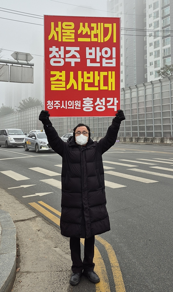 국민의힘 홍성각 충북 청주시의회 의원(사창동, 성화·개신·죽림동)이 수도권 생활 쓰레기의 청주 반입‧소각을 반대하는 1인 시위에 나섰다.