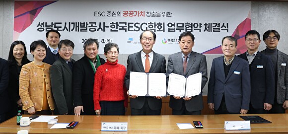 성남도시개발공사, 한국ESG학회와 업무협약 체결성남도시개발공사는 지난 8일 한국ESG학회와 ESG경영 실천 문화 확산과 지속가능한 공공가치 창출을 위해 업무협약을 체결했다. 이번 협약을 통해 양 기관은 환경·사회공헌·윤리경영 등 ESG 경영 실천 문화 확산을 비롯해 ESG 공동연구 및 상생 실행방안⋯