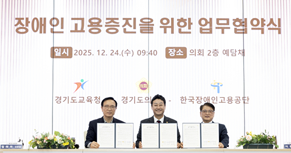경기도교육청-경기도의회-한국장애인고용공단, 장애인 고용증진 업무협약 체결경기도교육청이 지난 24일 경기도의회 예담채에서 경기도의회, 한국장애인고용공단과 함께 장애인 고용증진을 위한 업무협약을 체결했다. 이번 협약은 ‘장애인고용의무 이행’을 위해 3자 간 상호신뢰를 바탕으로 장애인 일자리를 지속적으로 창출하고 사회적 가치를⋯