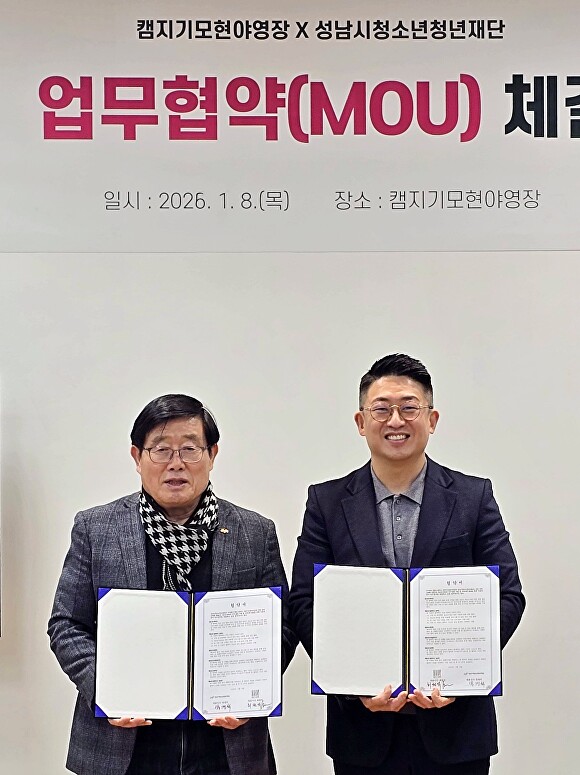 성남시청소년청년재단-㈜헬로그레이스 캠지기모현야영장, 여가활동 지원 업무협약 체결성남시청소년청년재단은 지난 8일 ㈜헬로그레이스 캠지기모현야영장과 청소년·청년의 환경보전 실천 및 친환경 여가문화 확산을 위한 업무협약을 체결했다. 이번 협약은 청소년·청년들이 숲을 보존하는 캠핑 문화를 지향하고 자연에 흔적을 남기지 않는 아웃도어 윤리⋯