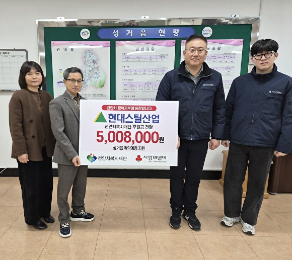 4년째 이어진 '급여 끝자리' 기부임직원 급여의 ‘끝자리’를 모은 작은 실천이 지역사회를 향한 꾸준한 나눔으로 이어지고 있다. 천안시는 지난 24일 현대스틸산업㈜이 취약계층 지원을 위해 성금 500만8000원을 기탁했다고 26일 밝혔다. 이번 성금은 임직원들이 매달 급여에서 끝자⋯
