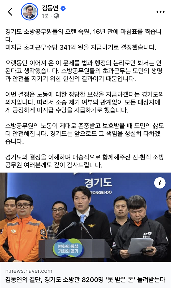 경기도, 전현직 소방공무원 8,245명에 미지급 초과근무수당 341억 원 지급 결정김동연 경기도지사의 SNS. 경기도가 전·현직 소방공무원 8,245명에게 미지급 초과근무수당 341억 원을 지급하기로 결정했다. 341억 원은 고등법원 화해권고에 따른 것으로 전·현직 소방공무원이 청구한 총액 563억 원 가운데 이자⋯